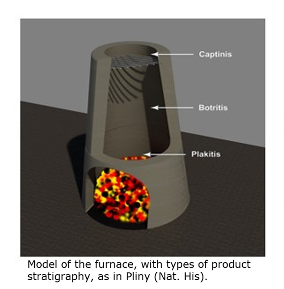 In the ancient period, Pliny the Elder reports the use of cadmea in alloying copper for the production of orichalcum, a process discussed in more detail in the following section. He then returns to cadmea more explicitly in Naturalis Historia (Book XXXIV, chapter 22, §100), describing it as a zinc-bearing material that could occur naturally but also be produced artificially in the furnace, particularly during silver smelting. Pliny notes that this furnace-derived cadmea was lighter and of inferior quality compared to the copper-bearing type and explains that, when heated, zinc oxide sublimates and condenses on the walls of the furnace. He further distinguishes several types of cadmea according to their position of formation and physical appearance: capnitis, the lightest form, attached to the smokestacks and resembling white ash; botrytis, an intermediate, heavier type forming in the central part of the chimney, red or ash-coloured; and plakitis, the heaviest and most impure form, pumice-like in appearance, accumulating at the base of the furnace. Pliny also differentiates subtypes of plakitis, namely onychitis (bluish) and ostracitis (black).