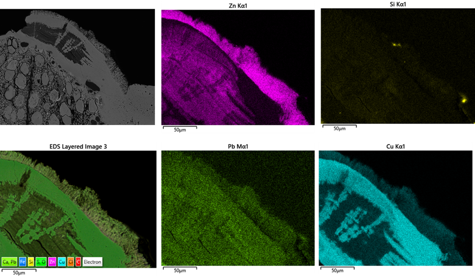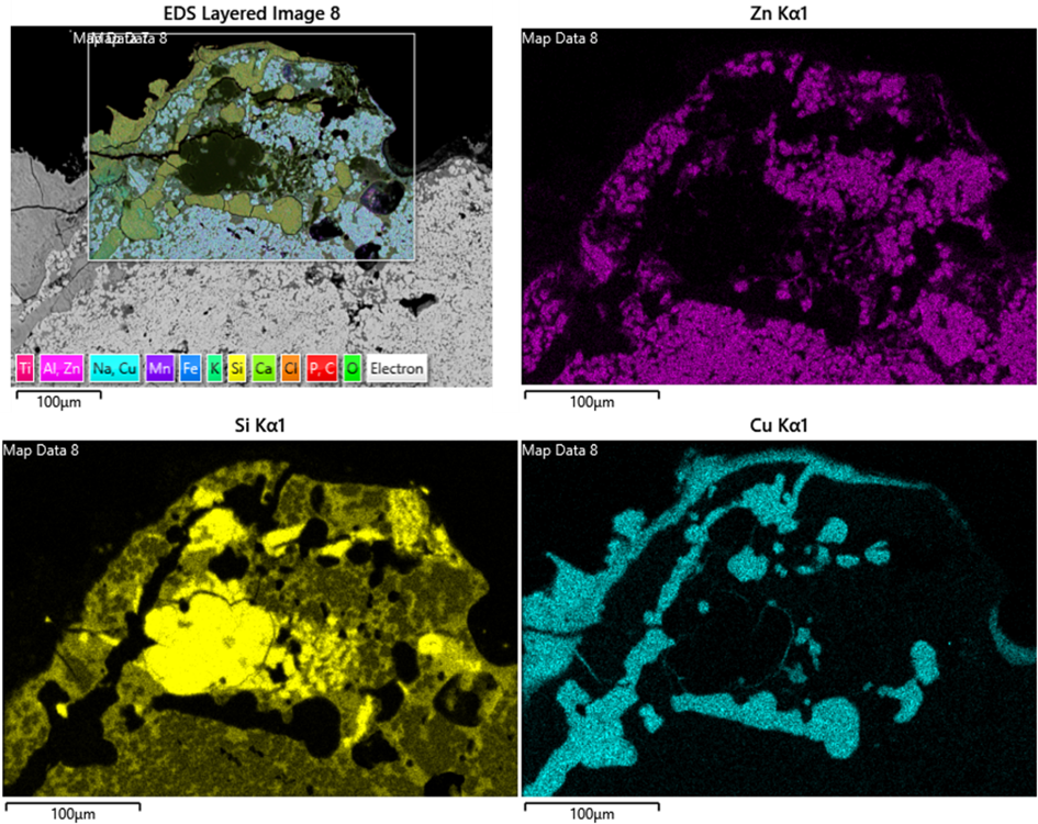 The analysis of the materials followed a strategy of progressive analytical deepening. Initial screening was carried out using pXRF to select the most promising samples, primarily those with higher zinc contents. The selected materials were then examined by optical microscopy and subsequently analysed by SEM–EDS after mounting polished sections in epoxy resin. The results show that, moving from furnace walls, ceramic lining, to crucibles and slags, zinc becomes increasingly intermixed and reactive. The furnace walls and linings are also indeed very sensitive to Zn dynamics. In all these contexts, materials act not only as passive substrates or media, but also as active participants in high-temperature reactions involving zinc.