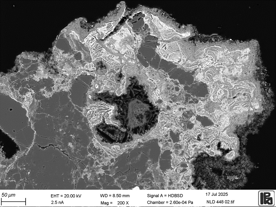 The comparison between furnace walls and crucibles highlights the complementary nature of these archives. Furnace linings primarily record vapour-phase transport, condensation and diffusion of zinc, effectively acting as a long-term recording of furnace atmosphere. The mineralogical form of zinc can provide indications of furnace atmosphere and function. On furnace walls and linings, zinc occurs mainly as zinc oxide and Zn–Fe oxides, including mixed spinels in which iron is trivalent (Fe³⁺), such as franklinite and zinc ferrite, pointing to oxidising conditions and vapour condensation. Seldom, the presence of copper absorption and lead is more limited to the surface, underlining different properties. In vitrified zones of furnace walls or linings, willemite and fayalite are also documented, indicating points of contact with the high temperature batch. Fragments of linings testify to high temperatures and close contacts to the melt mass, as testified by the presence of copper and lead matte prills and copper droplets.  Zinc oxide can be found in superficial, acicular coating, in the outermost layer, typical of crystallisation from vapour, and in layered compact structures below the surface.